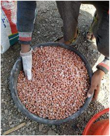 • Empty and dissolve the ready-made Rhizobium culture into the cooled sugar solution (200-400 g of powder/acre). Mix thoroughly so as to obtain uniform slurry.