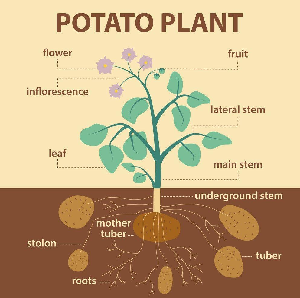 The potato stem system consists of stem, stolons and tubers. Plants grown from true seed have one main stem; while from a tuber a number of main stems may be produced. Lateral stems are branches of main stems.
