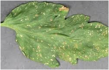 It is an common and major disease of tomato. Initially small, brown isolated spots are observed on leaf. Later spots are seen on stem and also on fruits. Fully developed spots become irregular, dark brown color with concentric ring inside spots. In severe condition, defoliation occurred. If infestation of early blight is observed, take spray of Mancozeb@400gm or Tabuconazol@200ml/200Ltr. Repeat spray 10-15 days after first spray. In cloudy weather, chances of incidence of early and late blight increases. As a preventive measure, spray with Chlorothalonil @ 250 gm / 100 Ltr of water. Also sudden rain pattern aggravate blight and other diseases take spray of Copper based fungicides@300gm/Ltr+Streptocycline@6gm/200Ltr water to control blight disease.